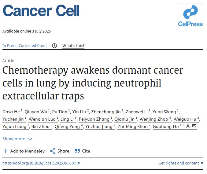 Het is de bedoeling dat chemotherapie kanker doodt in plaats van terugbrengt. Een baanbrekende studie in Cancer Cell onthult dat kankermedicijnen als doxorubicine en cisplatine slapende kankercellen kunnen reactiveren, met uitzaaiingen tot gevolg, met name in de longen.