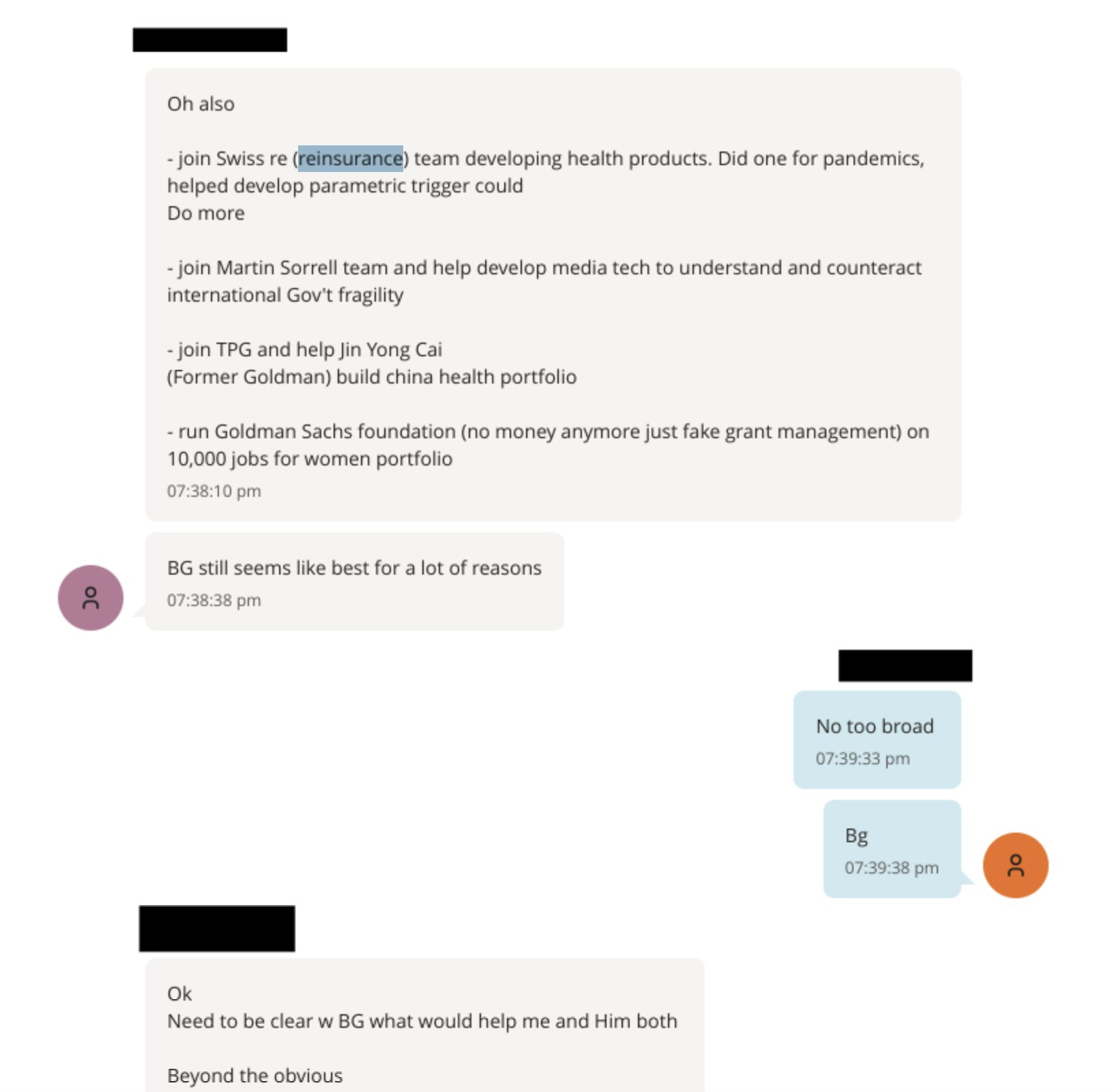 Ji beschrijft daarnaast hoe pandemiesimulaties in de documenten meerdere functies lijken te hebben. Interne stukken uit 2017 tonen dat simulaties niet alleen werden gebruikt voor technische voorbereiding, maar ook als opstap naar carrièrepaden binnen farmaceutische bedrijven, investeringsfondsen en internationale organisaties zoals het World Economic Forum.