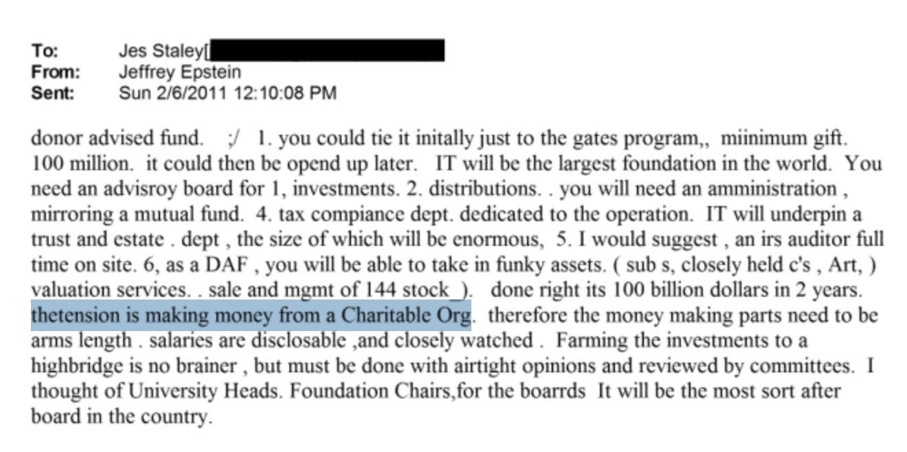 In dezelfde e-mailketens wijst Ji op passages waarin Epstein expliciet uitspreekt dat geld verdienen aan een liefdadigheidsorganisatie zorgt voor een spanningsveld. Daarin wordt beschreven dat winstgevende activiteiten op afstand moeten worden geplaatst, zodat commerciële opbrengsten juridisch gescheiden blijven van de liefdadigheidsorganisatie. Dit is een aanwijzing dat filantropische structuren werden gebruikt om investeringen mogelijk te maken die winst konden opleveren, zegt Ji.