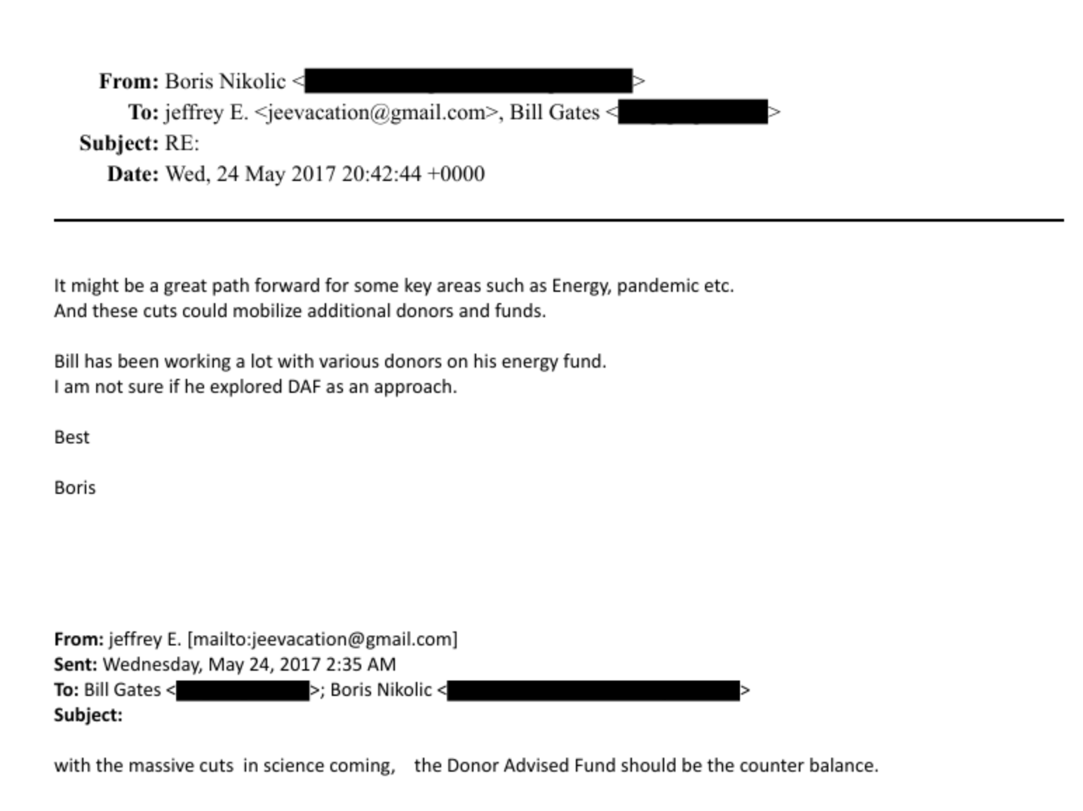 Een ander terugkerend thema is dat pandemieën al vóór COVID-19 werden gezien als een vaste strategische categorie. Ji verwijst naar een e-mail uit 2017 waarin Boris Nikolic, destijds wetenschappelijk adviseur van Gates, “pandemie” noemt als één van de kerngebieden voor donatiefondsen, naast sectoren zoals energie. Dit suggereert dat pandemieën niet uitsluitend als noodsituaties werden beschouwd, maar ook als een langdurig beleids- en investeringsveld.