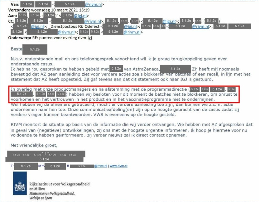 Het RIVM antwoordde dat er een gesprek was geweest met AstraZeneca, de productmanagers en de programmadirectie. De injecties van de bewuste batch werden echter niet uit de roulatie gehaald. Men wilde onrust voorkomen en het vertrouwen in het product en het vaccinatieprogramma niet ondermijnen.