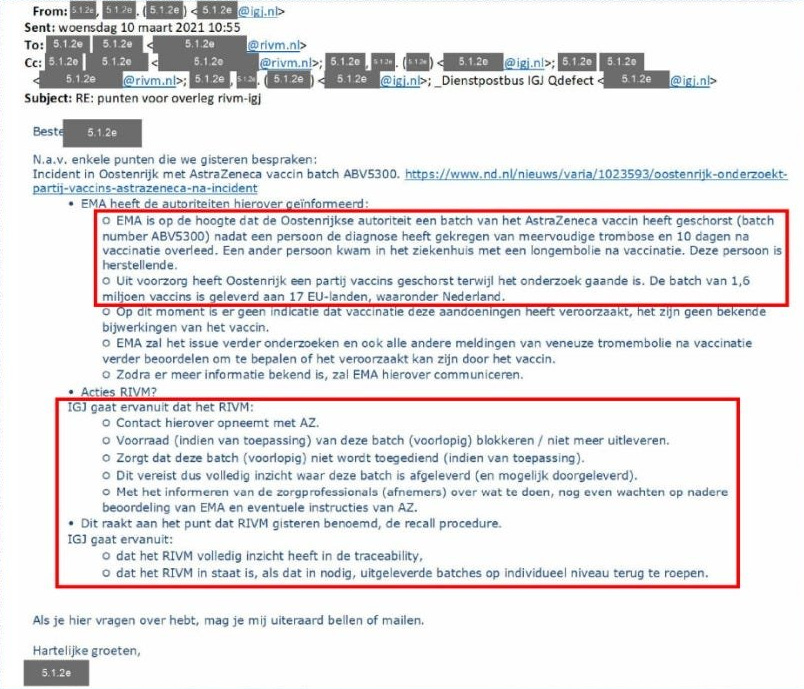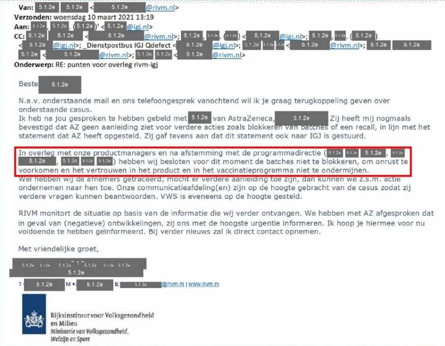 IGJ gaat ervan uit dat het RIVM de voorraad van deze batch (voorlopig) blokkeert en zorgt dat deze batch (voorlopig) niet wordt toegediend, schreef een medewerker van de inspectie op 10 maart 2021 in een e-mail aan het RIVM.