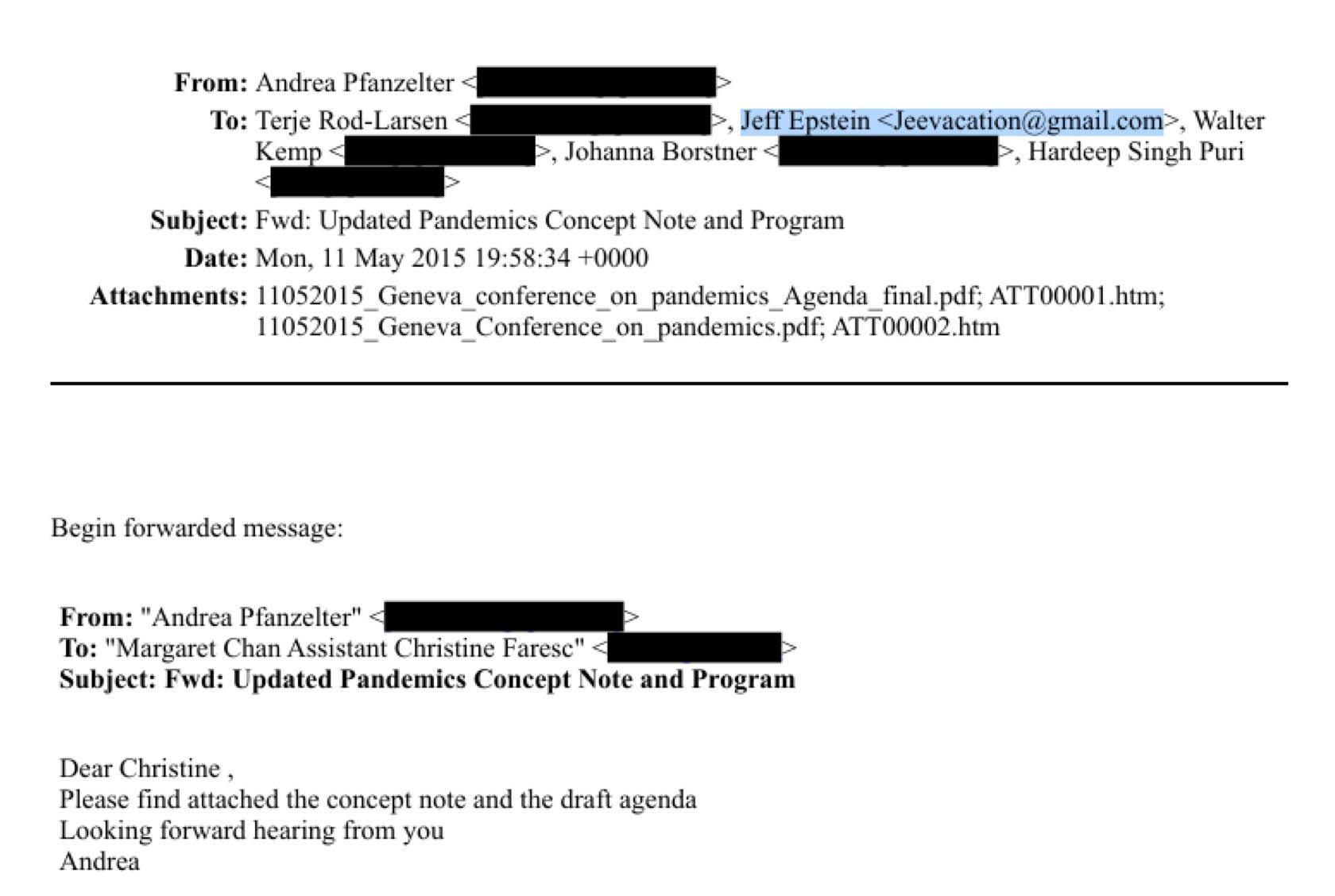 Nieuw vrijgegeven documenten uit de Epstein Files zorgen voor hernieuwde aandacht voor een internationale conferentie over pandemiebeleid die in 2015 plaatsvond bij de Verenigde Naties in Genève. Uit een analyse van publicist Sayer Ji (GreenMedInfo) blijkt dat de inmiddels overleden financier en zedendelinquent Jeffrey Epstein achter de schermen betrokken was bij de organisatie en financiering van deze bijeenkomst.