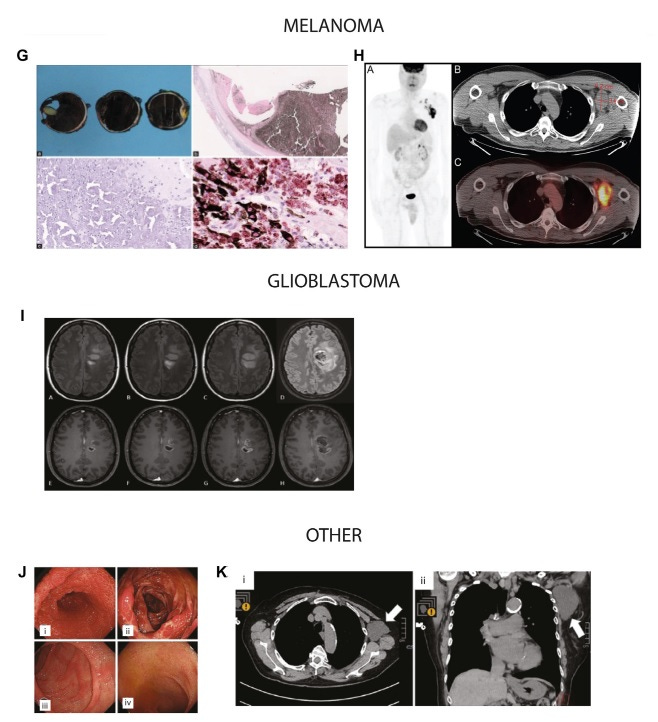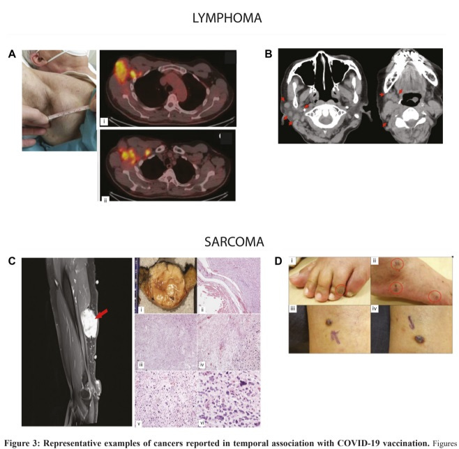 De beschreven kankertypen zijn divers. Het gaat onder meer om hematologische maligniteiten, zoals non-Hodgkinlymfomen, cutane lymfomen en leukemie, maar ook om solide tumoren, waaronder borst-, long-, pancreas- en huidkanker, sarcomen en glioblastomen. Over de verschillende publicaties heen signaleren de auteurs enkele terugkerende klinische patronen, waaronder een opvallend snelle tumorprogressie en herhaling of heractivatie van eerder stabiele ziektebeelden. Ook worden atypische histopathologische kenmerken genoemd, zoals afwijkingen nabij vaccinatieplaatsen of regionale lymfeklieren.
