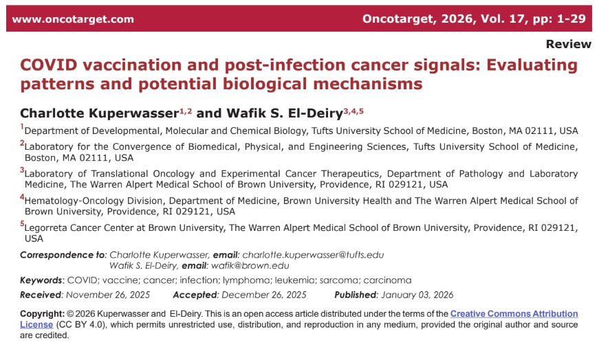 In het wetenschappelijke tijdschrift Oncotarget is recent een uitgebreide literatuurstudie verschenen waarin de link wordt onderzocht tussen COVID-19-vaccinatie en het ontstaan of gedrag van kanker. De studie is uitgevoerd door professor Charlotte Kupperwasser van de Tufts School of Medicine en arts-onderzoeker Wafik El-Deiry. De auteurs presenteren geen definitieve conclusies over oorzaak en gevolg, maar brengen bestaande wetenschappelijke signalen systematisch in kaart en bespreken hun mogelijke biologische betekenis.